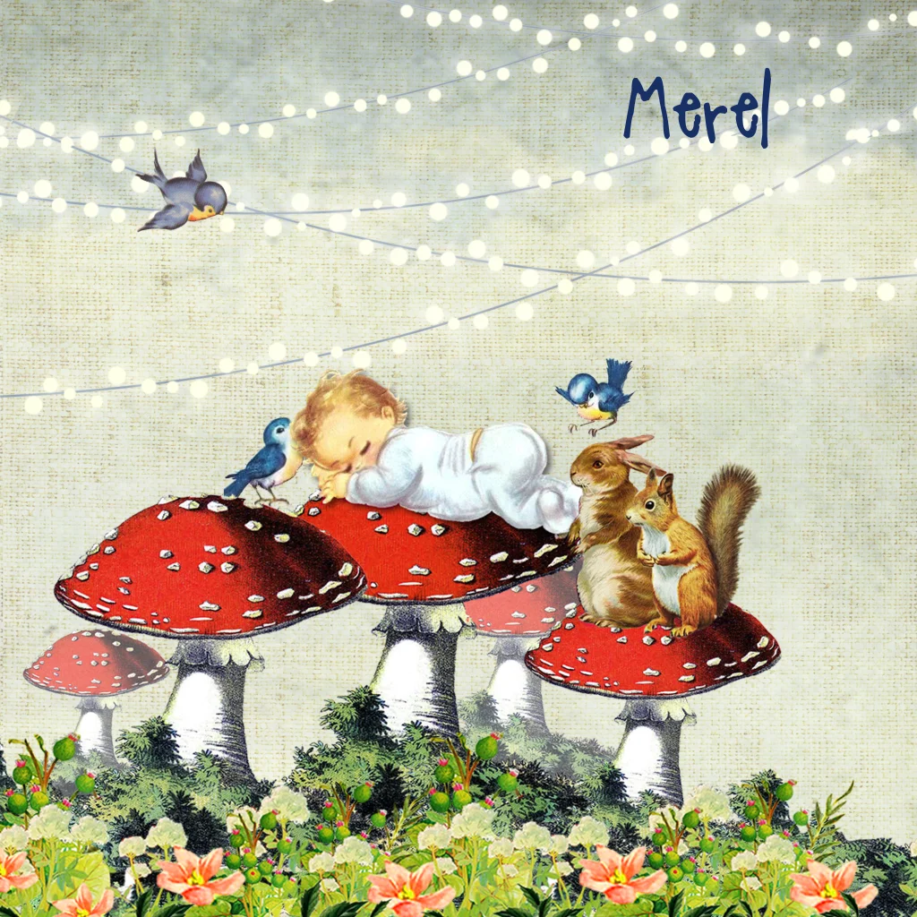 Geboortekaartje met slapend kindje in het bos op een rode paddenstoel met witte stippen en enkele vogeltjes eekhoorns. (7209)