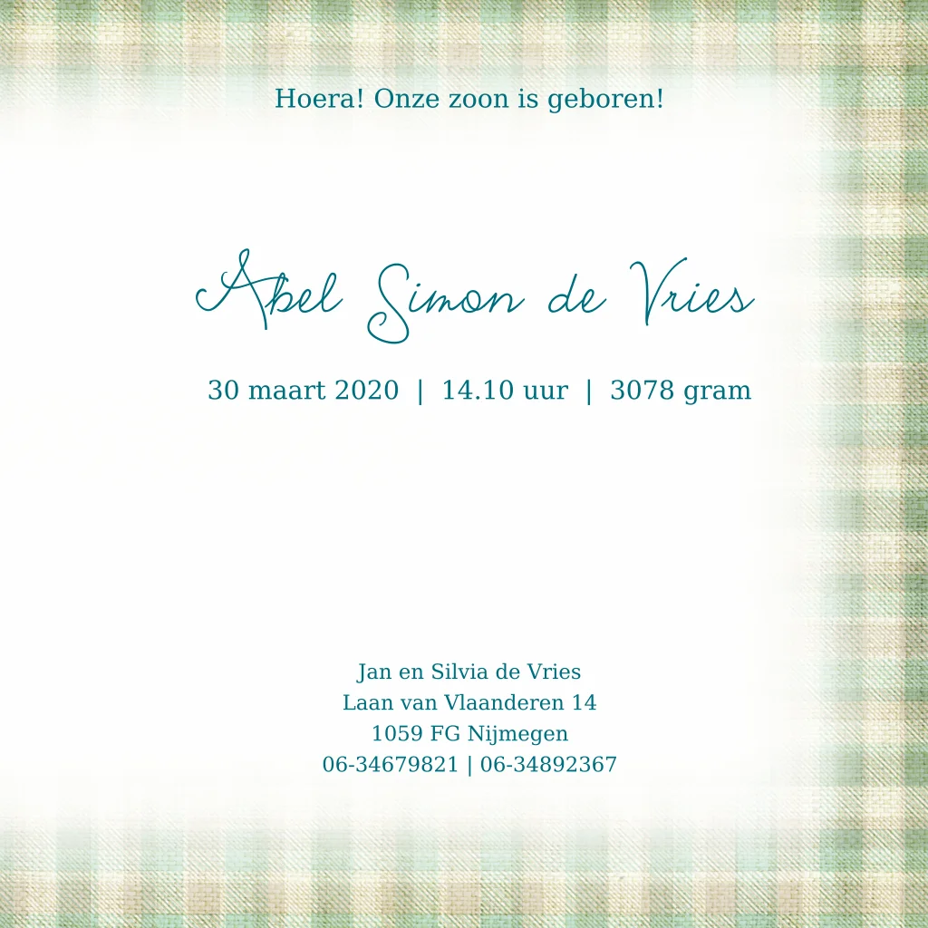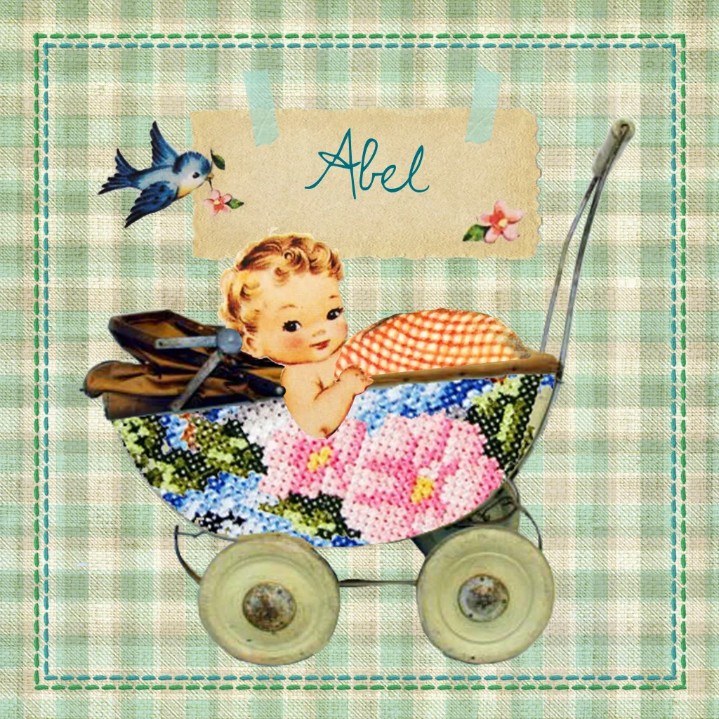Schattig retro geboortekaartje met wandelwagentje groene ruitjes