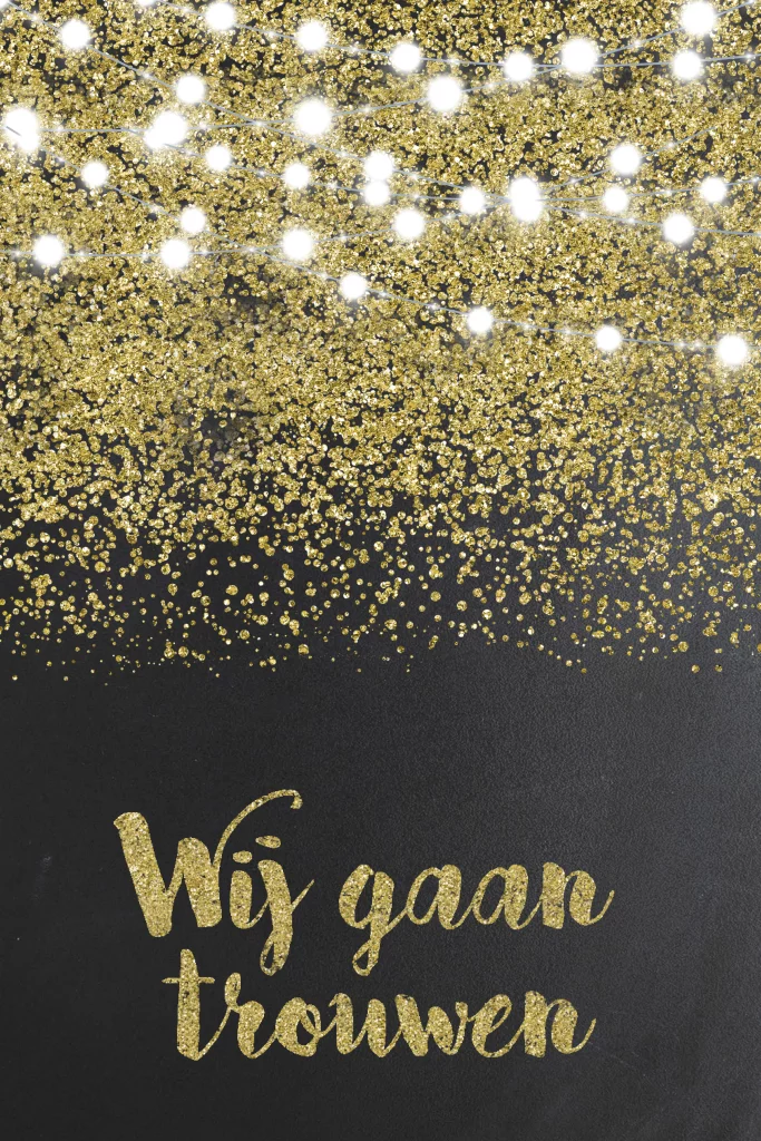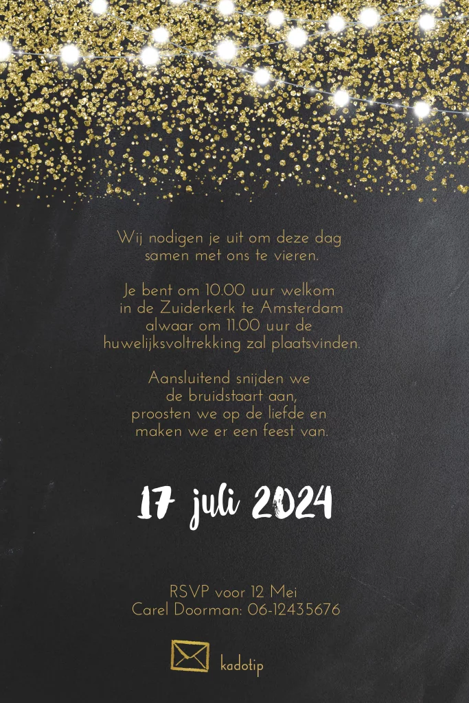 Wat een feestelijke trouwkaart. De goudkleurige glitters en lichtslingers beloven een spetterend feest op de mooiste dag van jullie leven. (7135)
