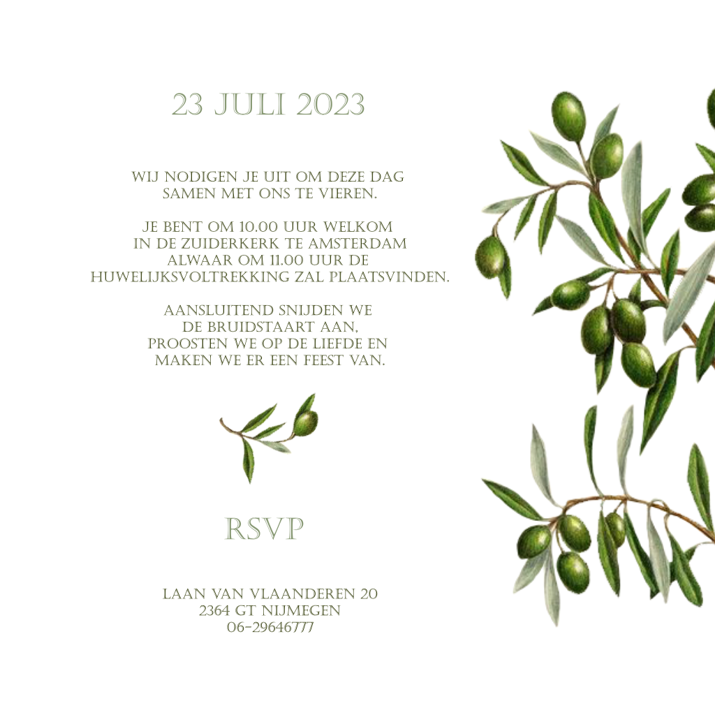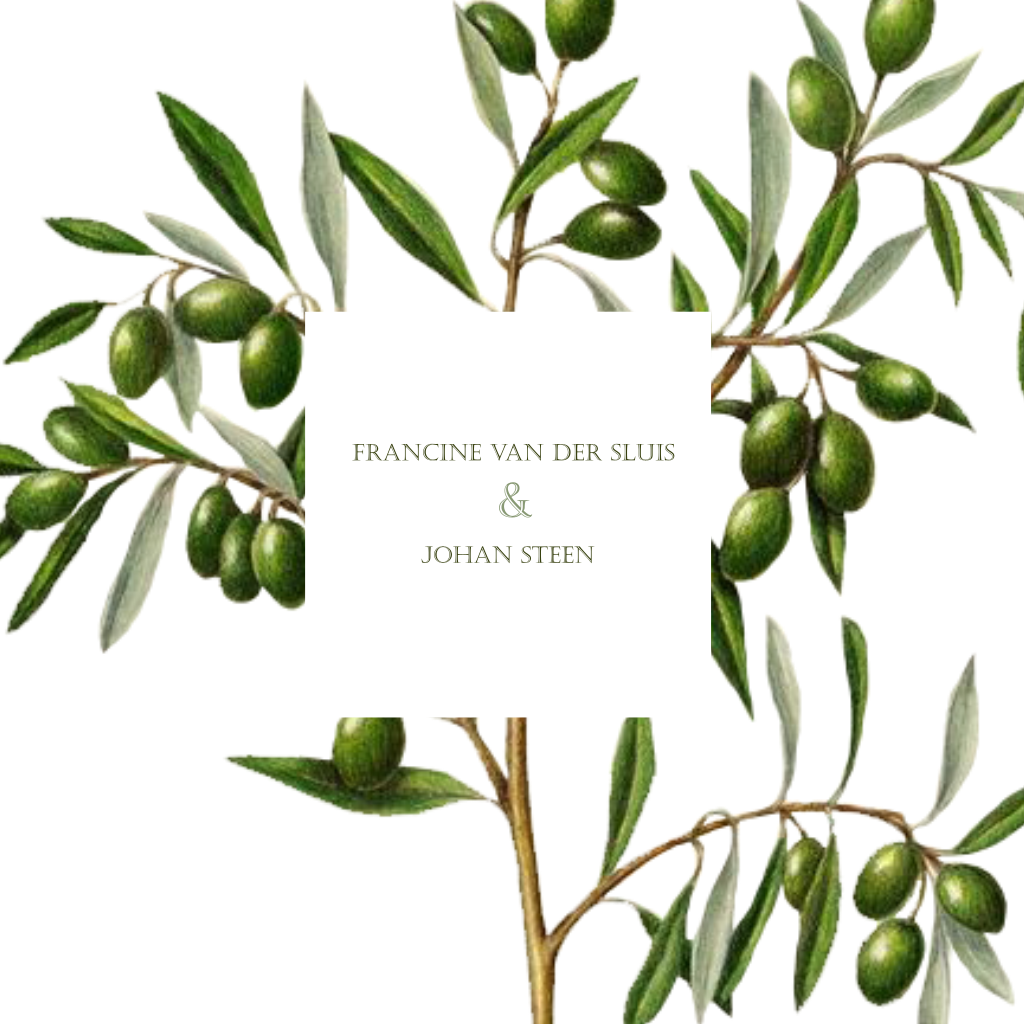 Deze trouwkaart met olijfboom is prachtig voor een mooi tuinfeest of trouwerij. (8392)