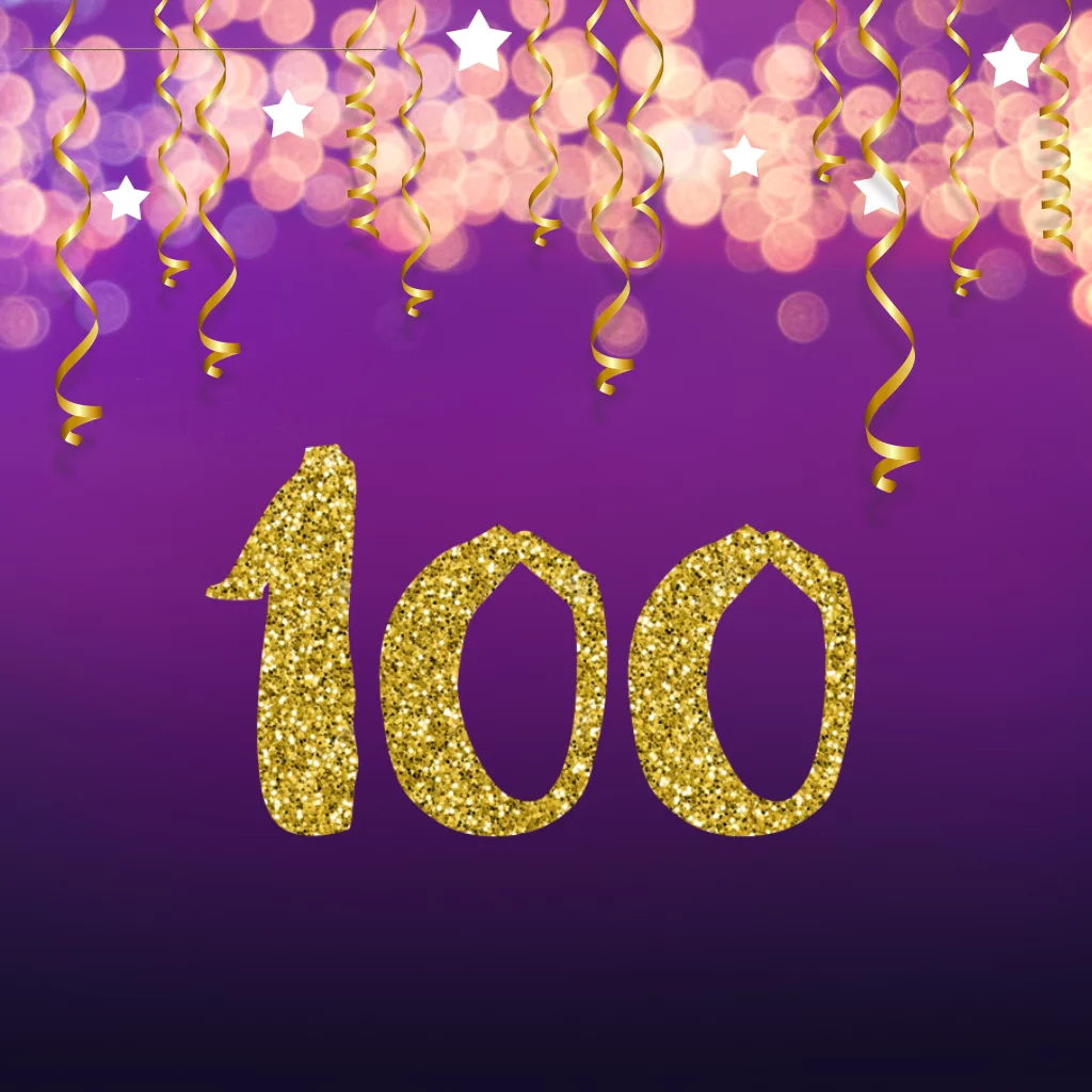 Uitnodiging 100 jaar verjaardag met paars met goudkleur met feestelijke slingers en goudkleurige glitters. (6555)