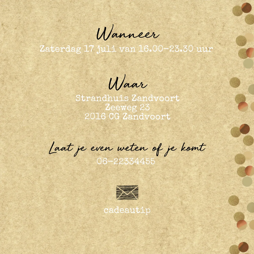 Uitnodigingskaarten 50 jaar getrouwd jubileum met goudkleurige glitters en confetti. Upload je eigen foto en combineer eens met de gouden envelop voor een extra feestelijke uitnodiging. (7679)