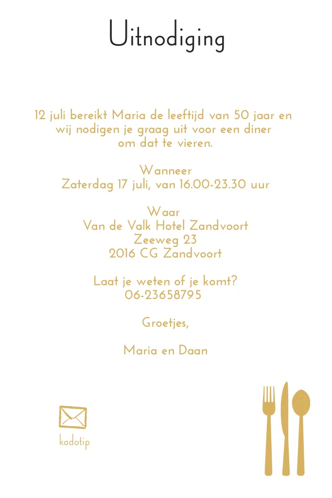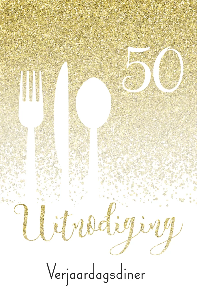 Uitnodiging 50 jaar verjaardag voor een diner met goud-look glitters. (7211) (Dit kaartje heeft nu ronde hoeken a € 0,30 per kaartje)