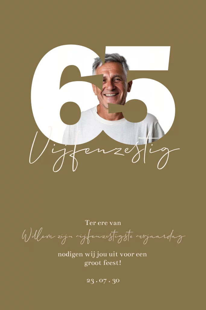 Uitnodiging voor een 65 jarige verjaardag in modern bruin tint met ruimte voor een eigen foto. (24491)