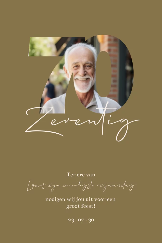 Uitnodiging zeventigste 70e verjaardag in modern bruine kleur met ruimte voor een eigen foto. (24491)