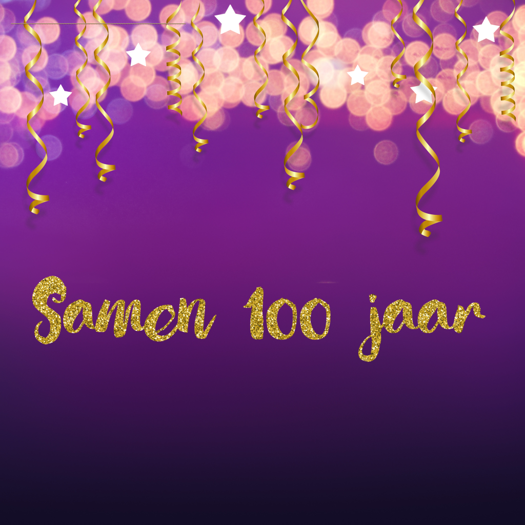 Samen 100 jaar uitnodiging met paars met goudkleur met feestelijke slingers en goudkleurige glitters. (6555)