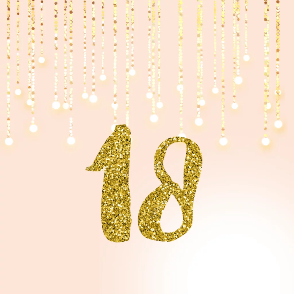 Uitnodiging 18 jaar in roze wit en goudkleur met feestelijke lampjes slingers. (7218) Wil je een ander jaartal in dezelfde stijl op de kaart? Kijk bij afbeeldingen > cijfers of neem contact met ons mee. We zetten dit gratis voor je om.