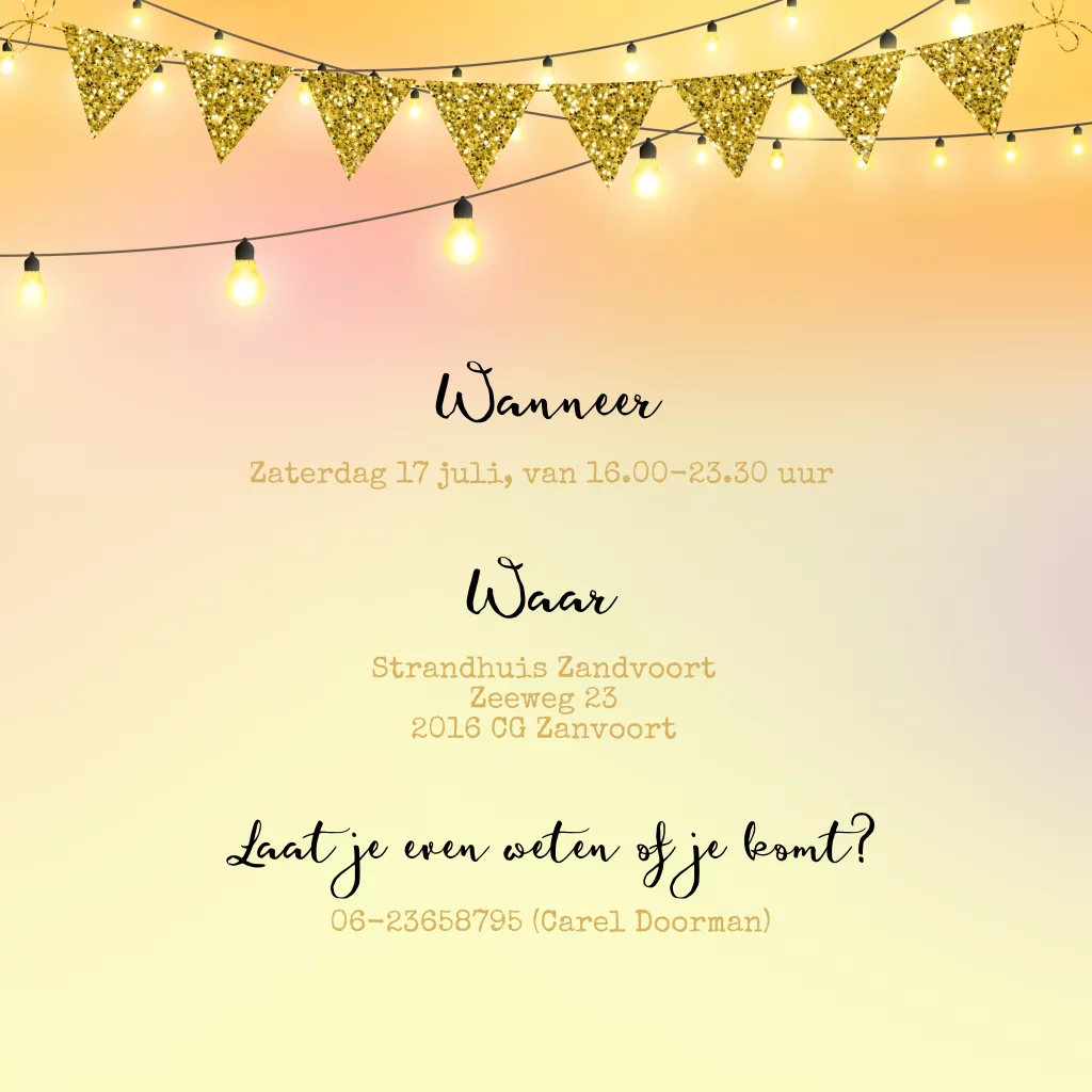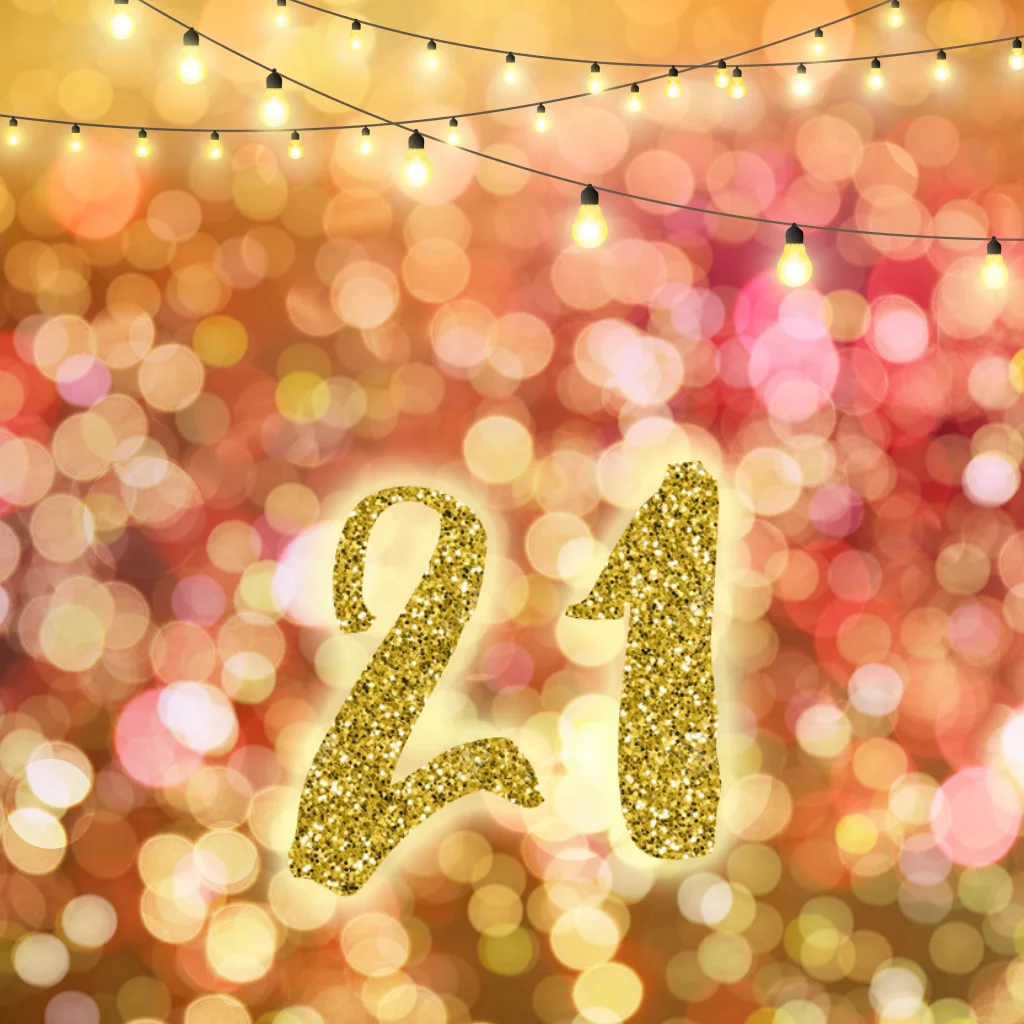 Een lieve en romantische uitnodiging voor een 21e verjaardag / 21-diner. Goudkleurige glitter slingers en lichtslingers maken het een feestelijk geheel. (6539)