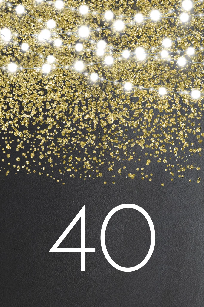Uitnodiging 40 jaar verjaardag zwart met goudkleurige glitters op krijtbord. (7139)