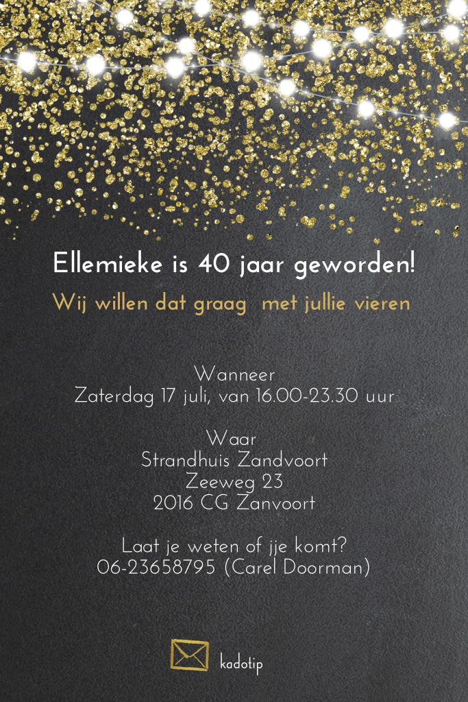 Stoere uitnodiging 40 jaar met gouden glitters op krijtbord