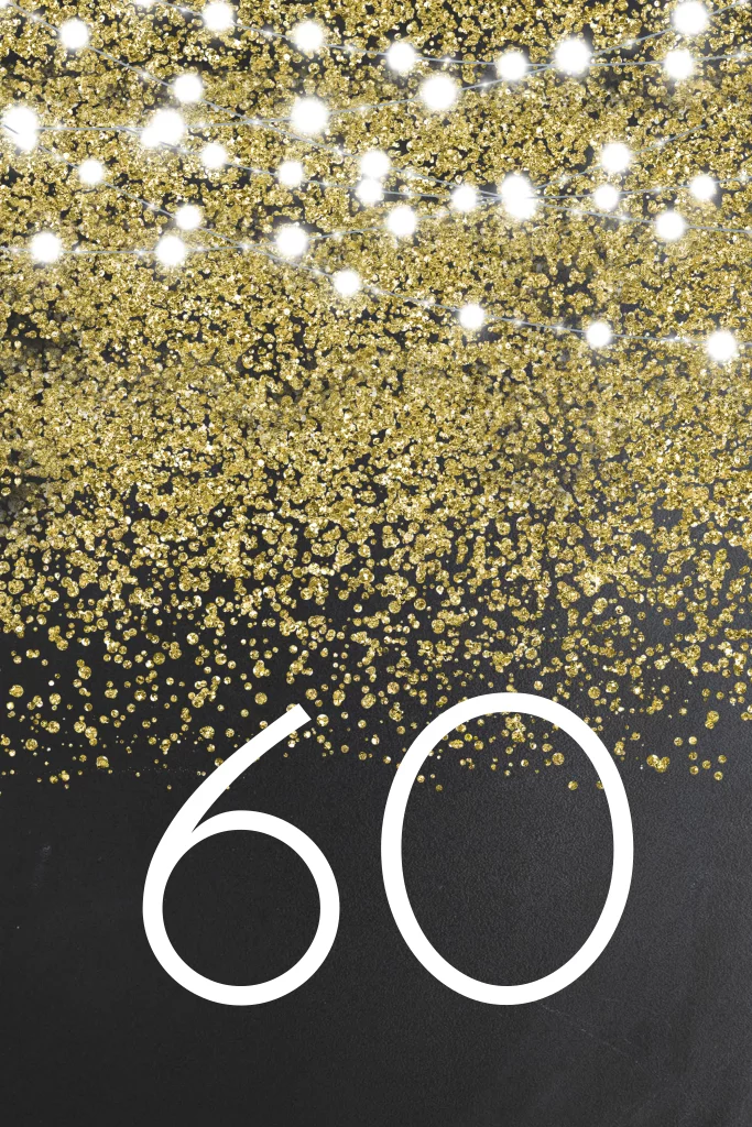 Verjaardag 60 jaar uitnodiging feesthe met goudkleurige glitters op krijtbord. (7139)