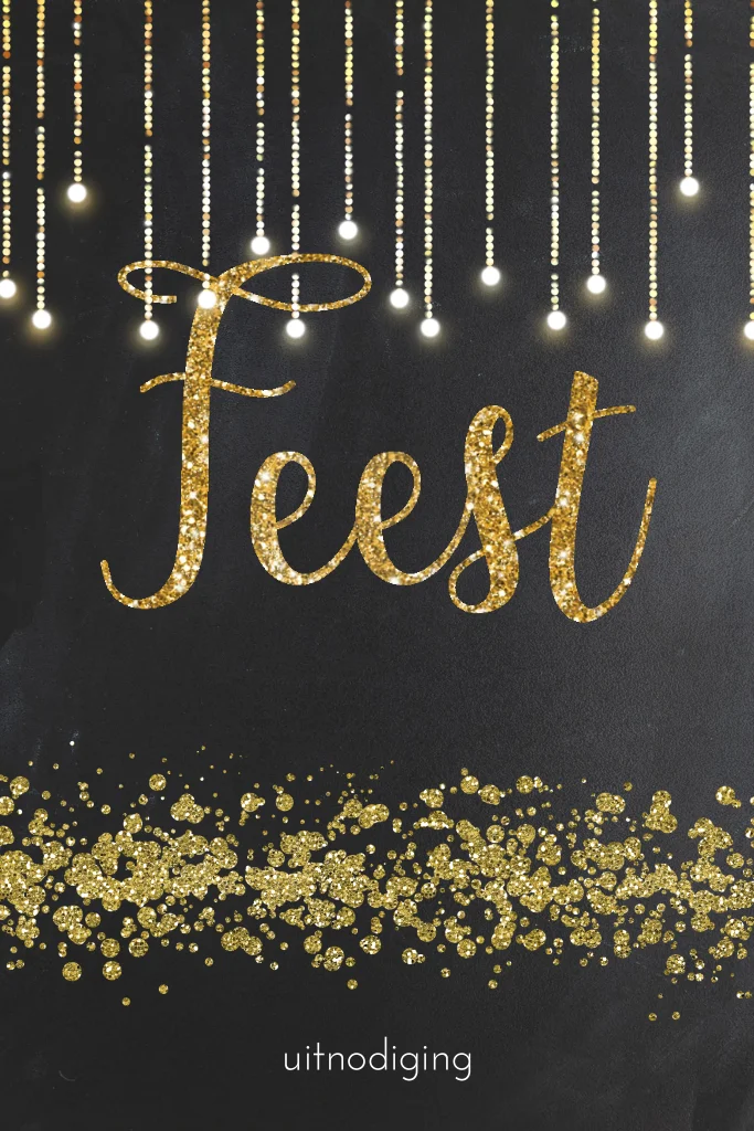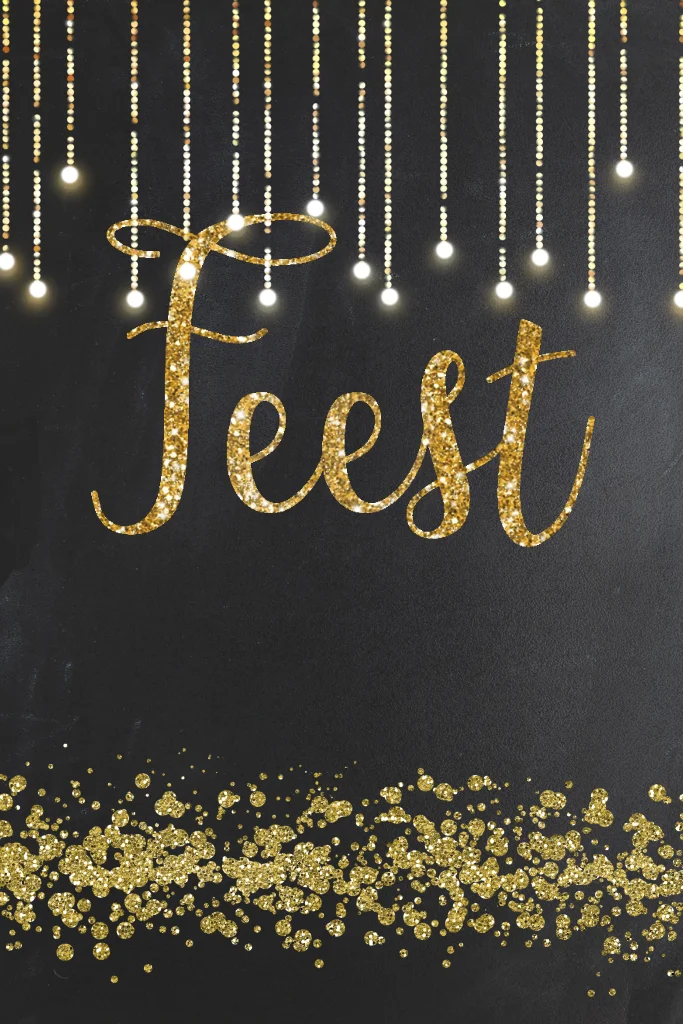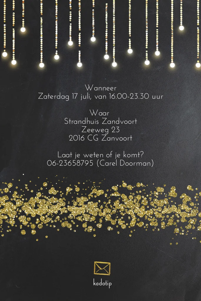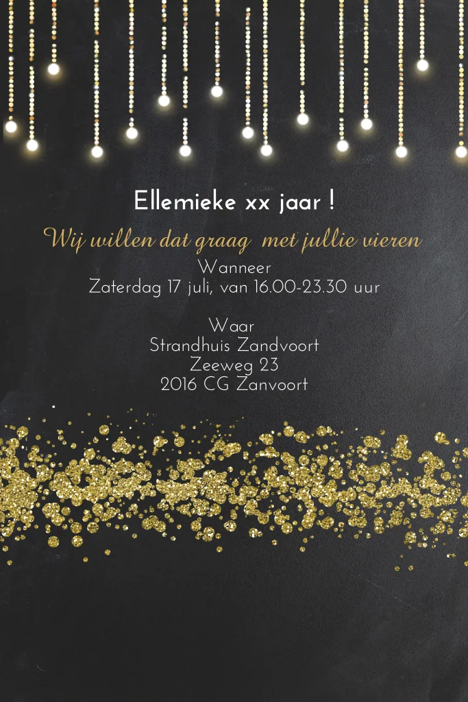 Uitnodiging voor een feest in de kleur zwart met goudkleurige glitters op krijtbord look achtegrond met feestelijke lampjes. (7137)