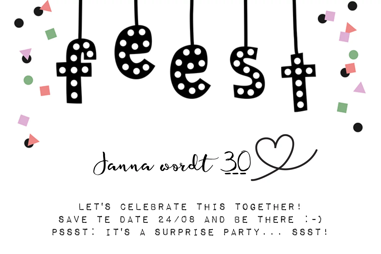 Super hippe uitnodiging voor een gezellige party 30 jaar oud! Origineel, hip en trendy kaartje met feest slingers en toffe confetti, om jouw verjaardag aan te kondigen. (7255)