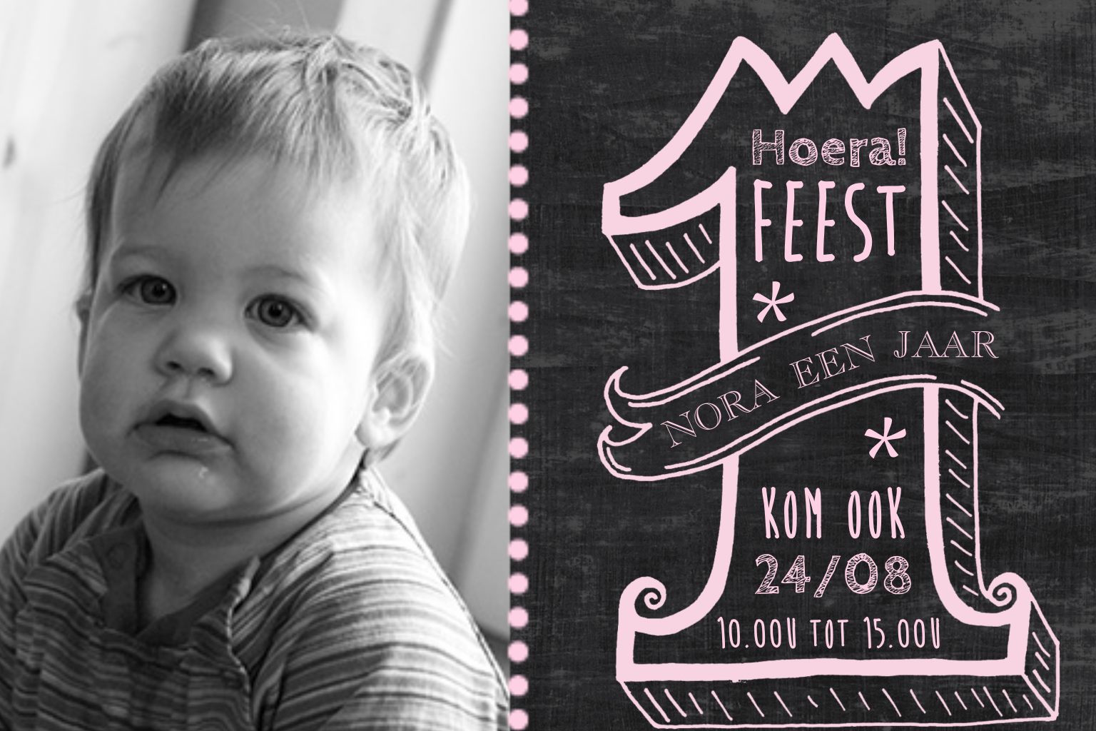 Uitnodiging 1e verjaardag met krijtbord en eigen foto