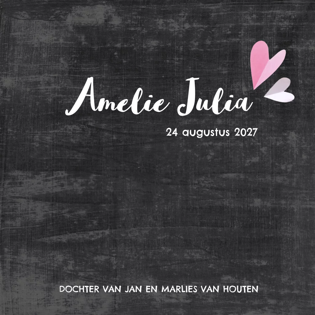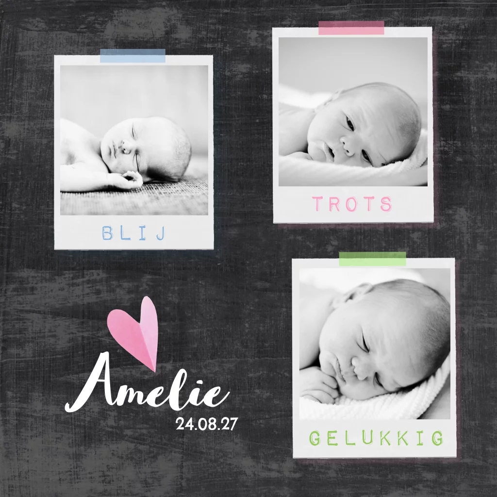 Geboortekaartje voor een meisje met fotocollage en krijtbord