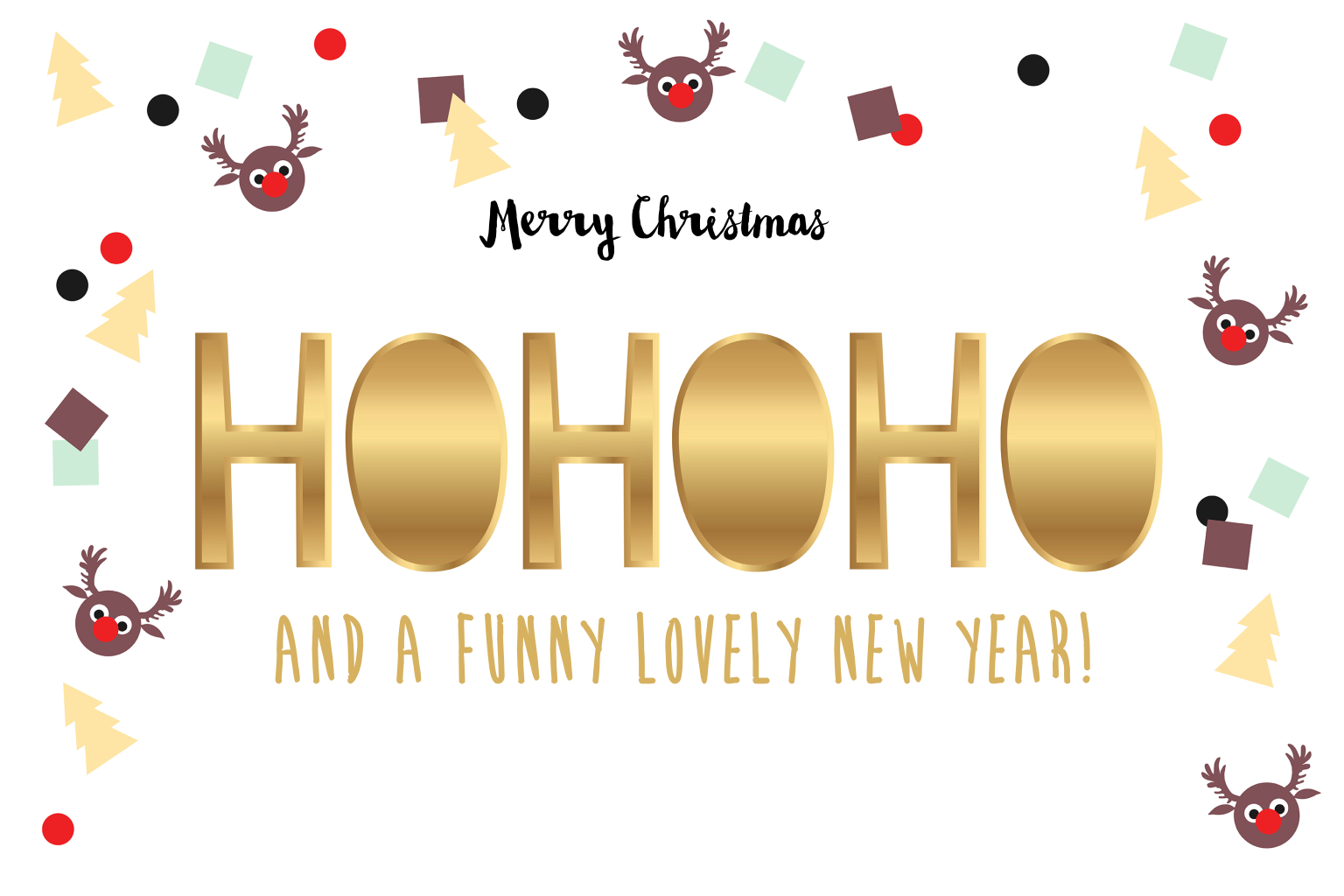 Vrolijke en originele kerstkaart in goudkleur en wit met de tekst ho ho ho. Illustratie van rendier en kerstboom confetti. Merry christmas. (7745)
