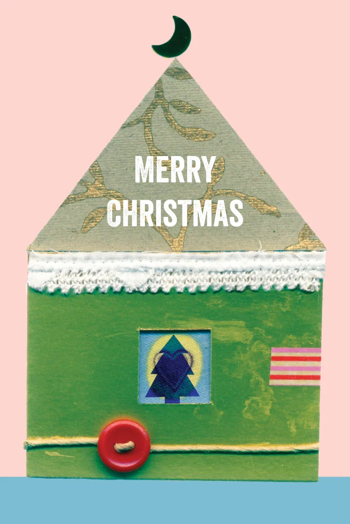 Super originele kerstkaart met illustratie van sfeervol huisje. Een collage kaart met lieve kerstgroet voor de hele familie. (24308)