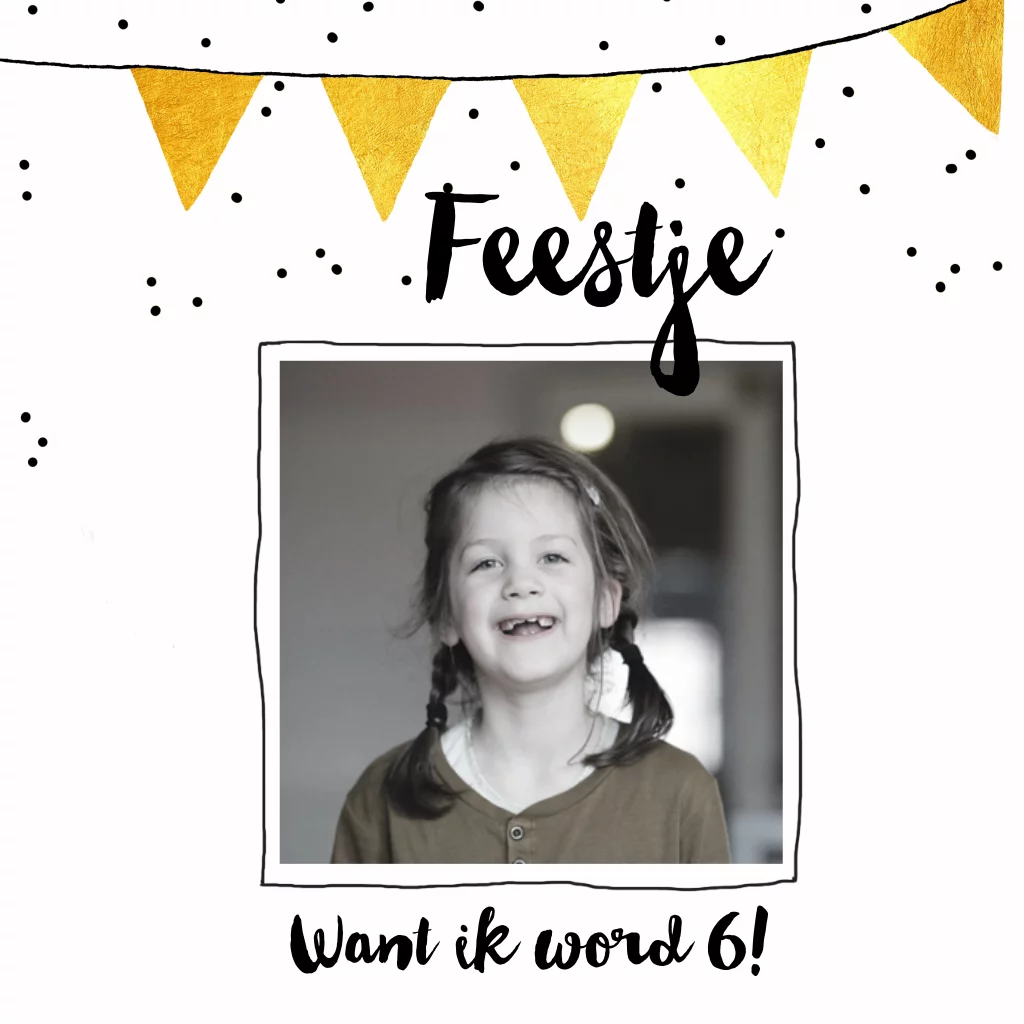 Hip zwart-wit kaartje als uitnodiging voor een kinderfeestje. Origineel en feestelijk kaartje met print van goudkleurige vlaggetjes en zwarte stipjes confetti. Geen echt goud! (5624).