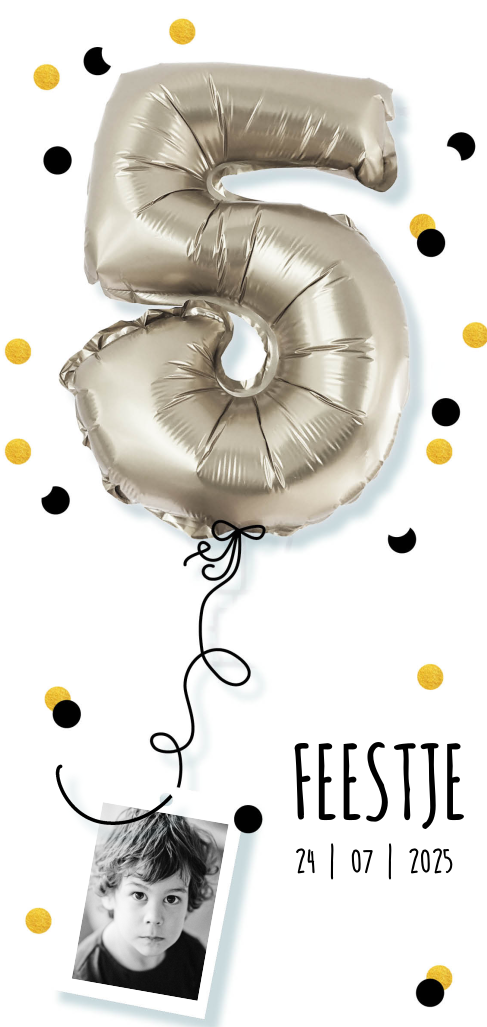 Originele en feestelijke trendy uitnodiging voor een hip kinderfeestje! Toffe kaart met print van een zilveren folie ballon en geel zwarte confetti. (6563)