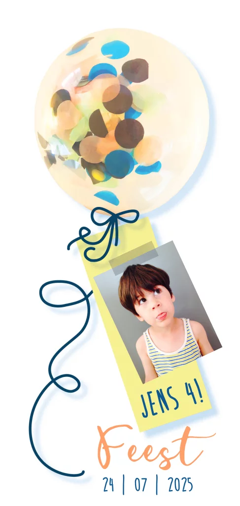 Te gekke gezellige kinderfeestje uitnodiging voor een jongen, met hippe en trendy confetti ballon. Origineel en vrolijk kaartje met hangende labels aan de ballon en ruimte voor eigen foto. (6541)