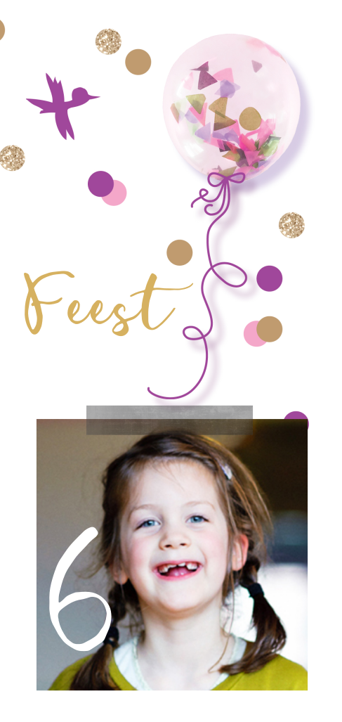 Te gekke gezellige kinderfeestje uitnodiging voor een meid, met hippe en trendy confetti ballon. Origineel en vrolijk kaartje met ruimte voor grote eigen foto van je dochter. (6545)