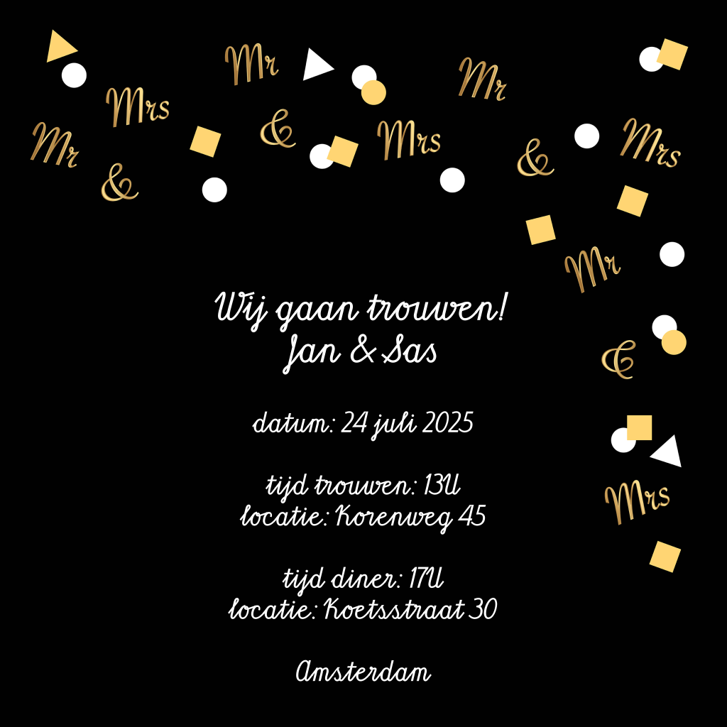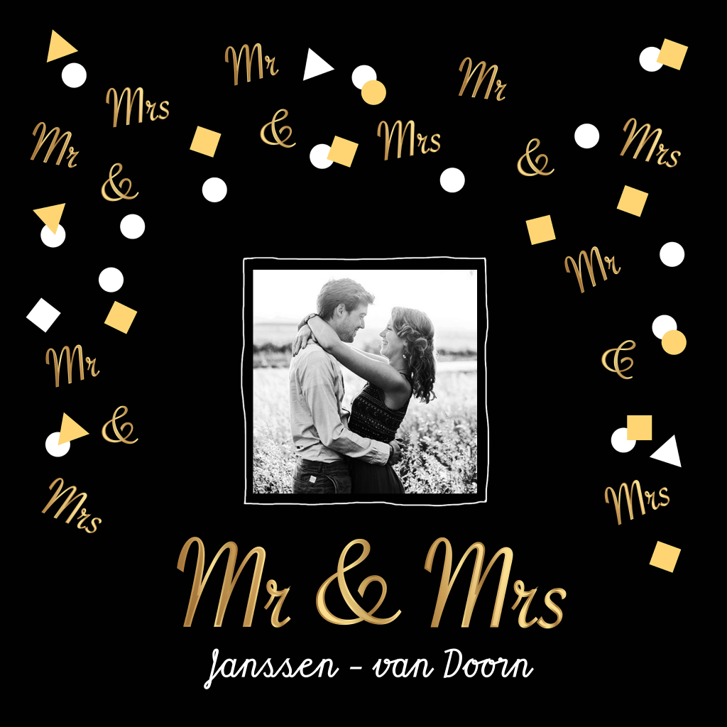 Unieke stijlvolle trouwkaart voor jullie grote dag! Originele sjieke feestelijke kaart met mr. en mrs. confetti in goud-look. (7418)