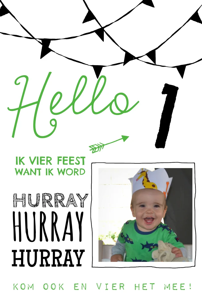 Uitnodiging 1e verjaardagsfeestje zwart wit met vlaggetjes