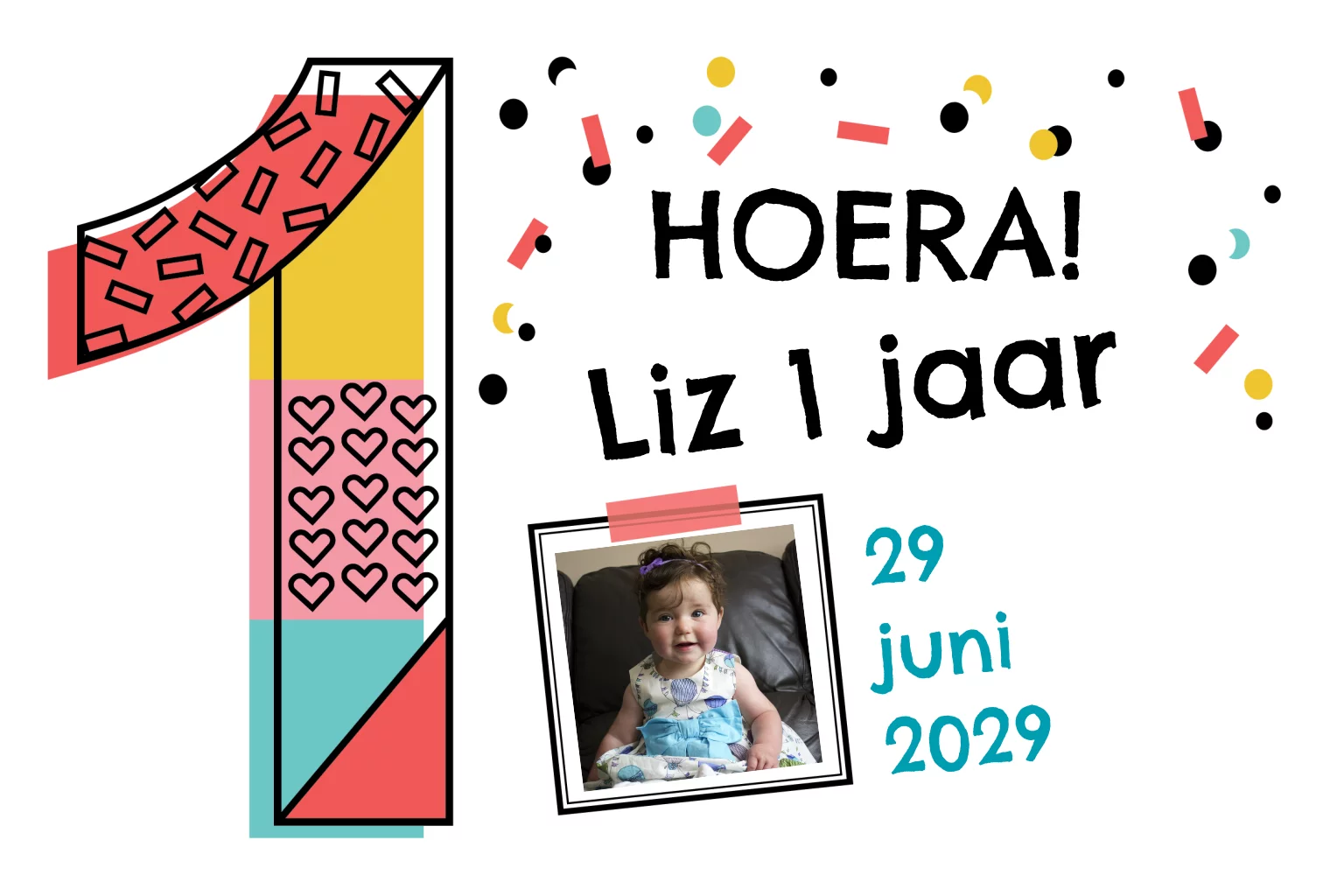 Een vrolijke uitnodiging voor het vieren van haar eerste verjaardag. Met grote versierde 1 en gezellige confetti nodig je de mensen uit voor een feestje. (23744)
