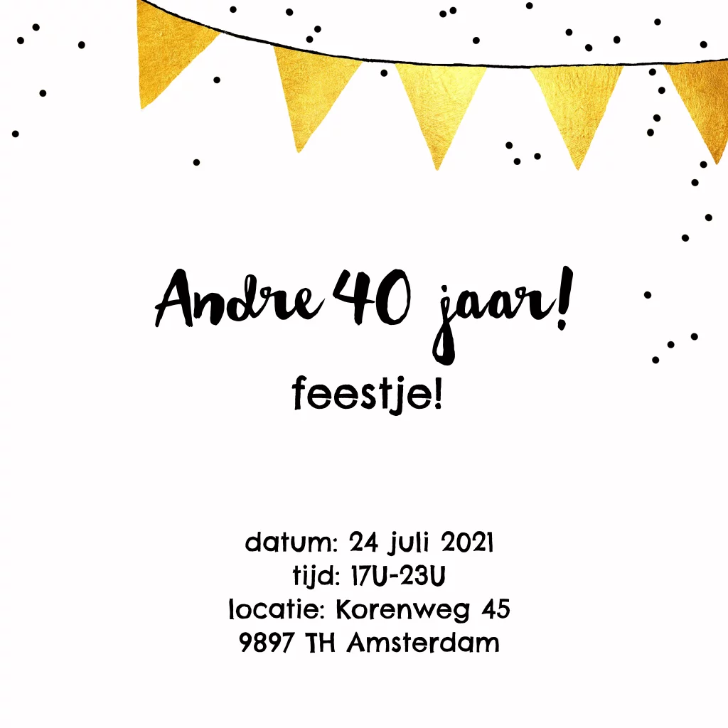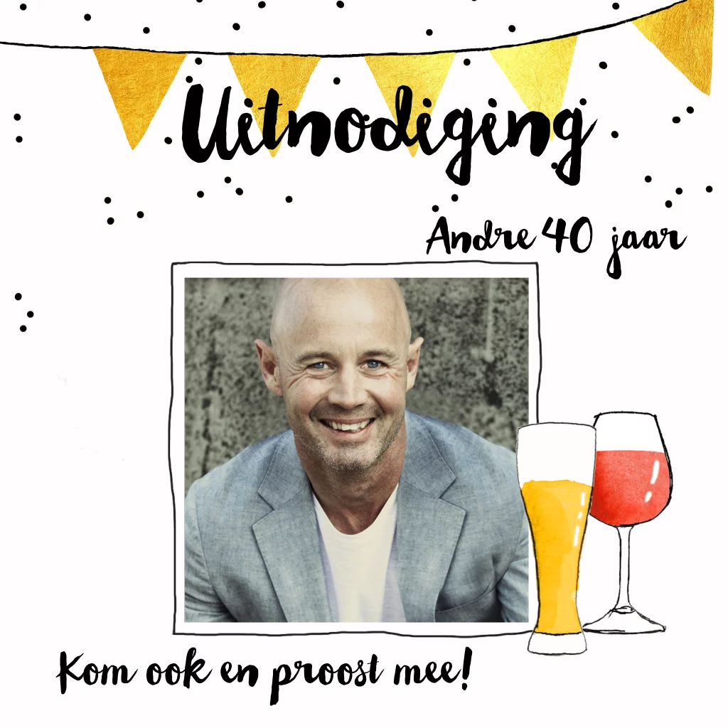 Leuke uitnodiging voor een verjaardagsfeestje voor een man van 40 jaar. Origineel en gezellig kaartje met vlaggetjes van goudkleur, zwarte confetti stippen en getekend biertje en wijntje. Let op, geen echt goud!. Vervang je eigen foto en het aantal jaar. (5624).