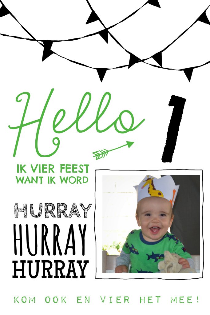 Uitnodiging 1e verjaardagsfeestje zwart wit met vlaggetjes