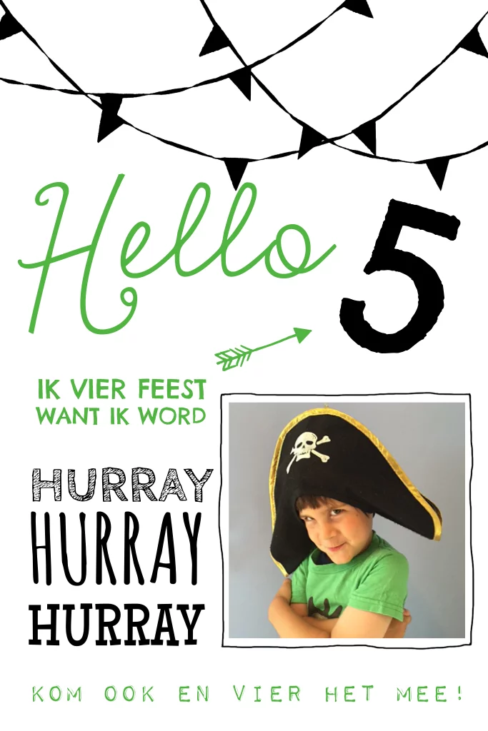 Uitnodiging kinderfeestje zwart wit met vlaggetjes