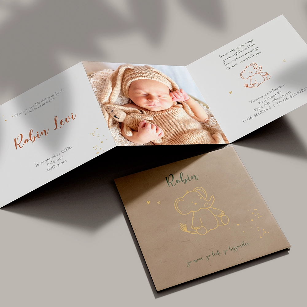 3luik geboortekaartje olifant en foto drieluik zigzag