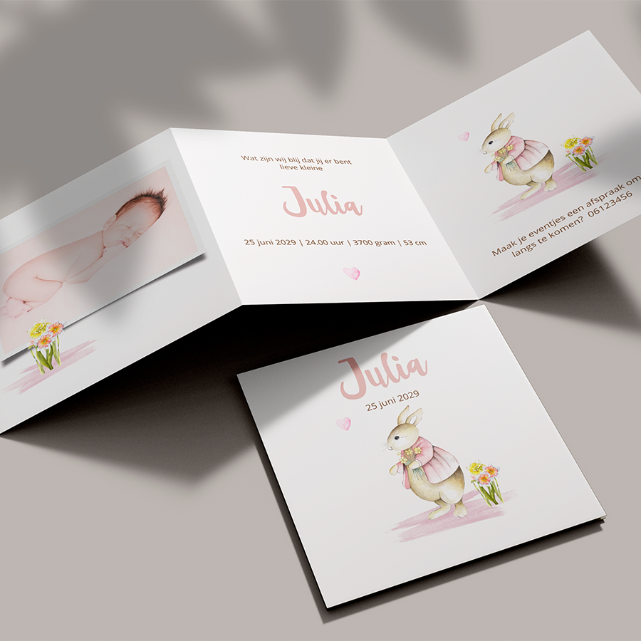 Geboortekaartje voor een meisje in drieluik formaat met ruimte voor het plaatsen van een eigen foto. Een lieve afbeelding van een konijntje en bloemen. (999999)