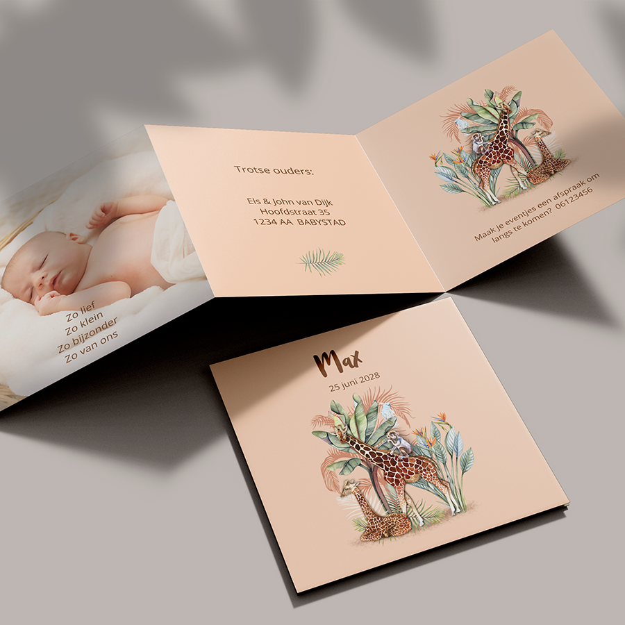 Geboortekaartje drieluik voor een jongen of meisje in junglestijl met giraf en andere leuke jungledieren en tropische planten. (24554)