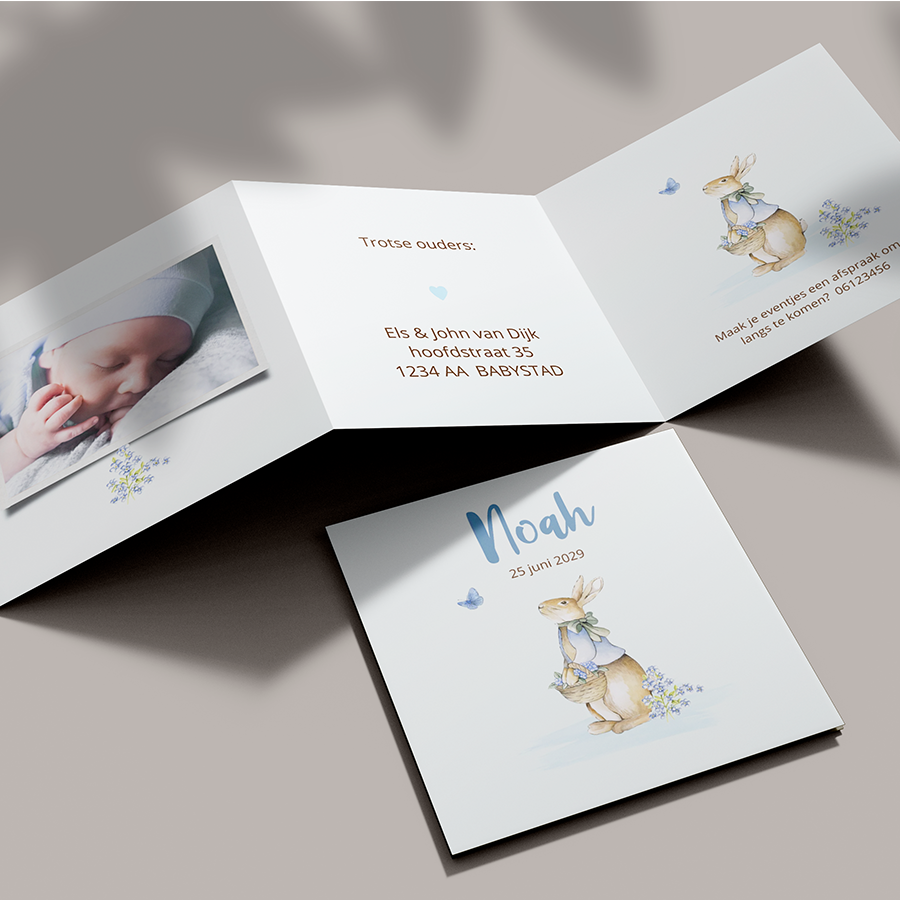 Geboortekaartje jongetje in drieluik formaat met foto en konijntje