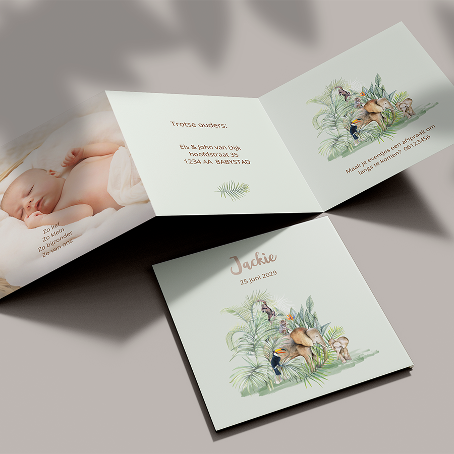 Drieluik geboortekaartje jongetje met jungle olifantje