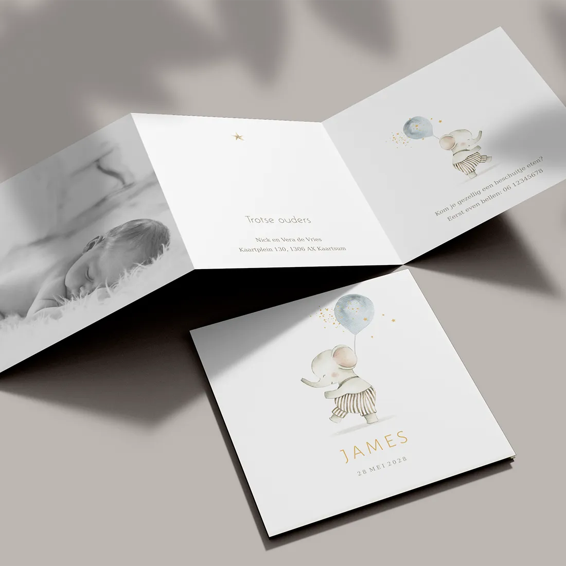 Lief drieluik geboortekaartje jongetje met olifantje zigzag