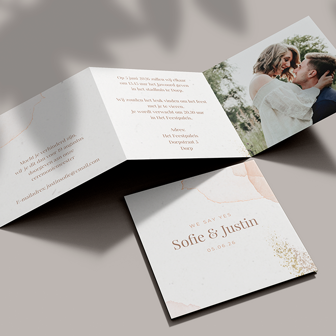 Hippe drieluik trouwkaart met waterverf achtergrond, goudkleurige spetters en ruimte voor een eigen foto. (23873)