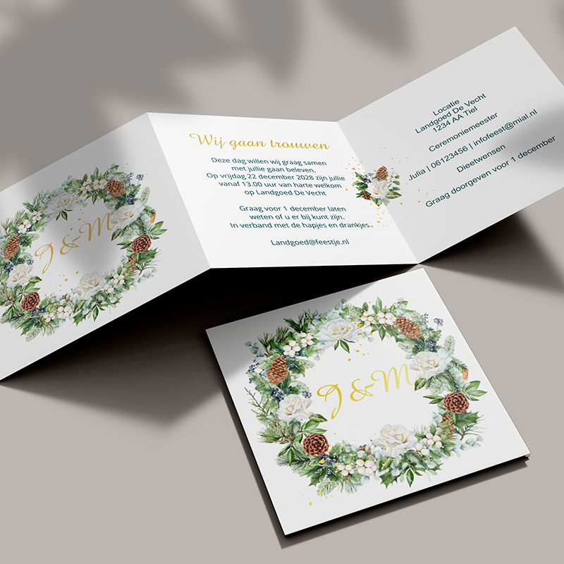 Trouwkaart met mooie botanische krans met witte rozen en kersttakken in de winter.