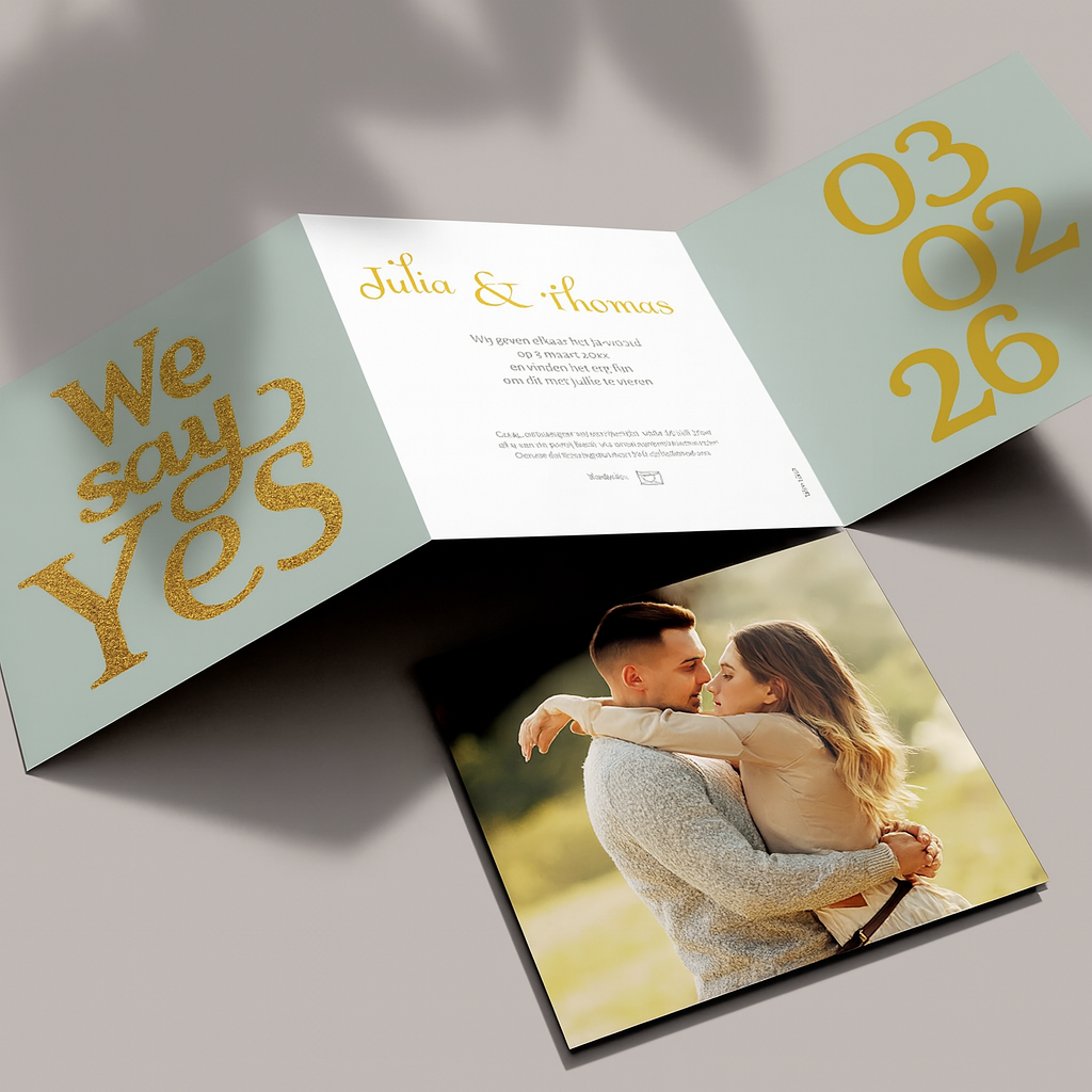 Trouwkaart drieluik met foto en goudkleurige letters zigzag