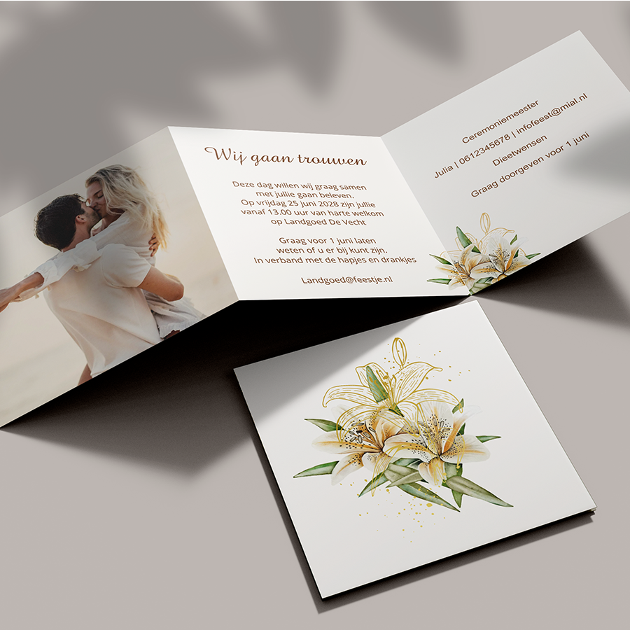 Trouwkaart drieluik met eigen foto en mooie witte lelie