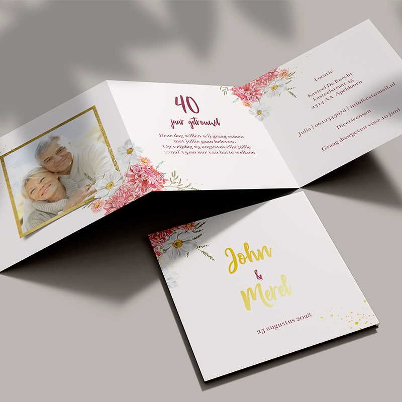 Jubileum 40 jaar getrouwd uitnodiging drieluik foto dahlia