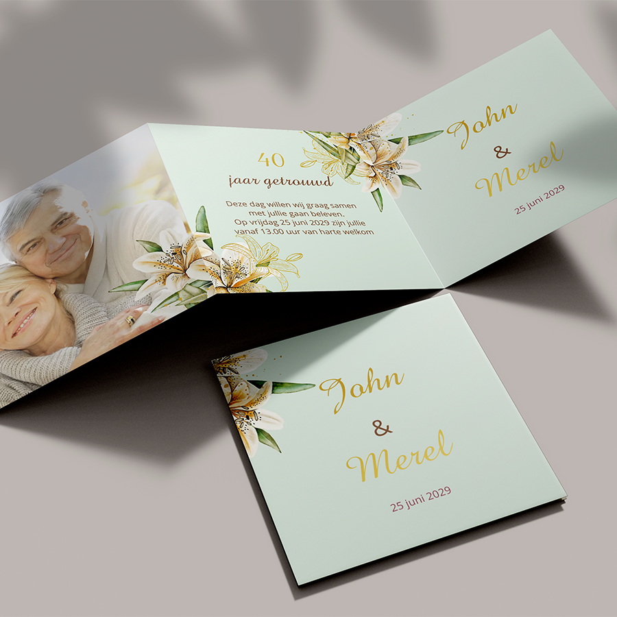 Jubileum uitnodiging 40 jaar getrouwd drieluik met foto en witte lelie
