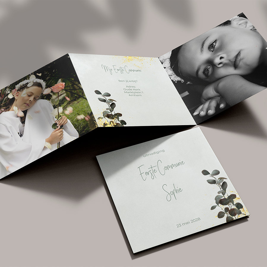 Uitnodiging eerste communie met geschilderde eucalyptus takjes, ruimte voor een eigen foto's. Warme groene achtergrondkleur en goudlook verf spetters. (22731)