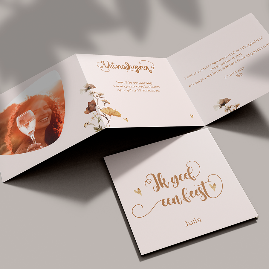 Hippe uitnodiging verjaardag vrouw 50 jaar in drieluik. Met ruimte voor 1 of 2 keer een eigen foto en droogbloemen in warme aardetinten. (23723) Deze kaart kan ook zonder fotokader en de kleur kan naar wens aangepast worden. Heb je hier hulp bij nodig? Neem contact op.