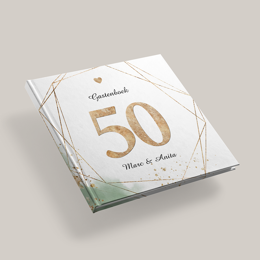 Gastenboek voor een huwelijks jubileum feestje 50 jaar getrouwd. Op de achtergrond staan mooi gekleurde groene watercolor en goud look versieringen. (23709) Wil je een ander jaartal in dezelfde stijl? Kijk bij afbeeldingen > cijfers of neem contact met ons mee. We zetten dit gratis voor je om.