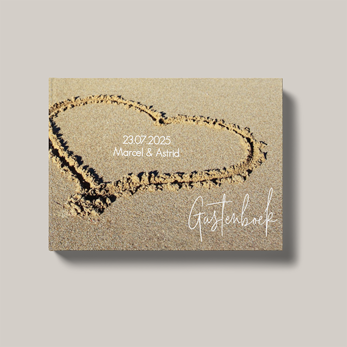 Gastenboek met het een hart in het zand op het strand. (21004) Let op: je dient het gastenboek naar wens aan te passen en de voorbeeldteksten te wijzigen. Het gastenboek heeft 36 vellen en 72 bladzijden. Dit is standaard en kan niet aangepast worden. Alle binnenpagina's zijn wit, onbedrukt en beschrijfbaar. De omslag ( voor en achterzijde ) is helemaal naar eigen wens te ontwerpen.