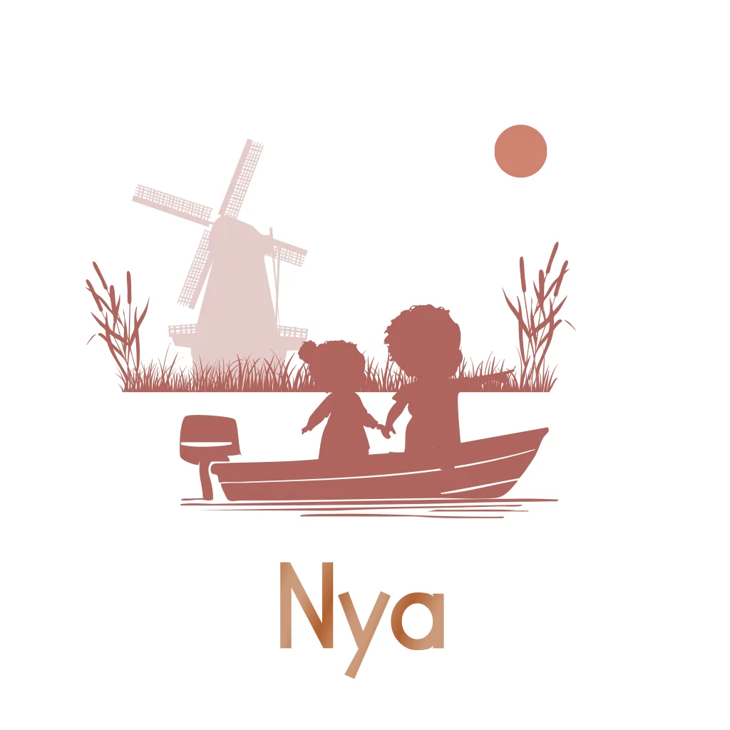 Geboortekaartje 2e kindje meisje met broer op boot silhouet molen