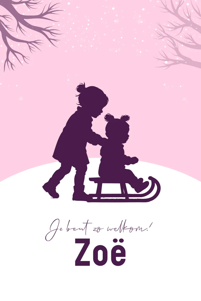 Geboortekaartje voor een tweede kindje een meisje met een winters thema. Grote zus met zusje en slee. (30083)Deze kaart heeft ronde hoeken, maar kan ook met rechte hoeken ( - 0,30 per kaartje)