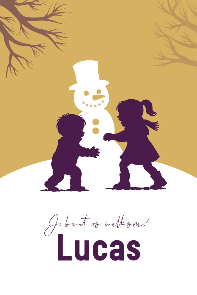 Winters geboortekaartje 2e kindje jongen met grote zus en sneeuwpop